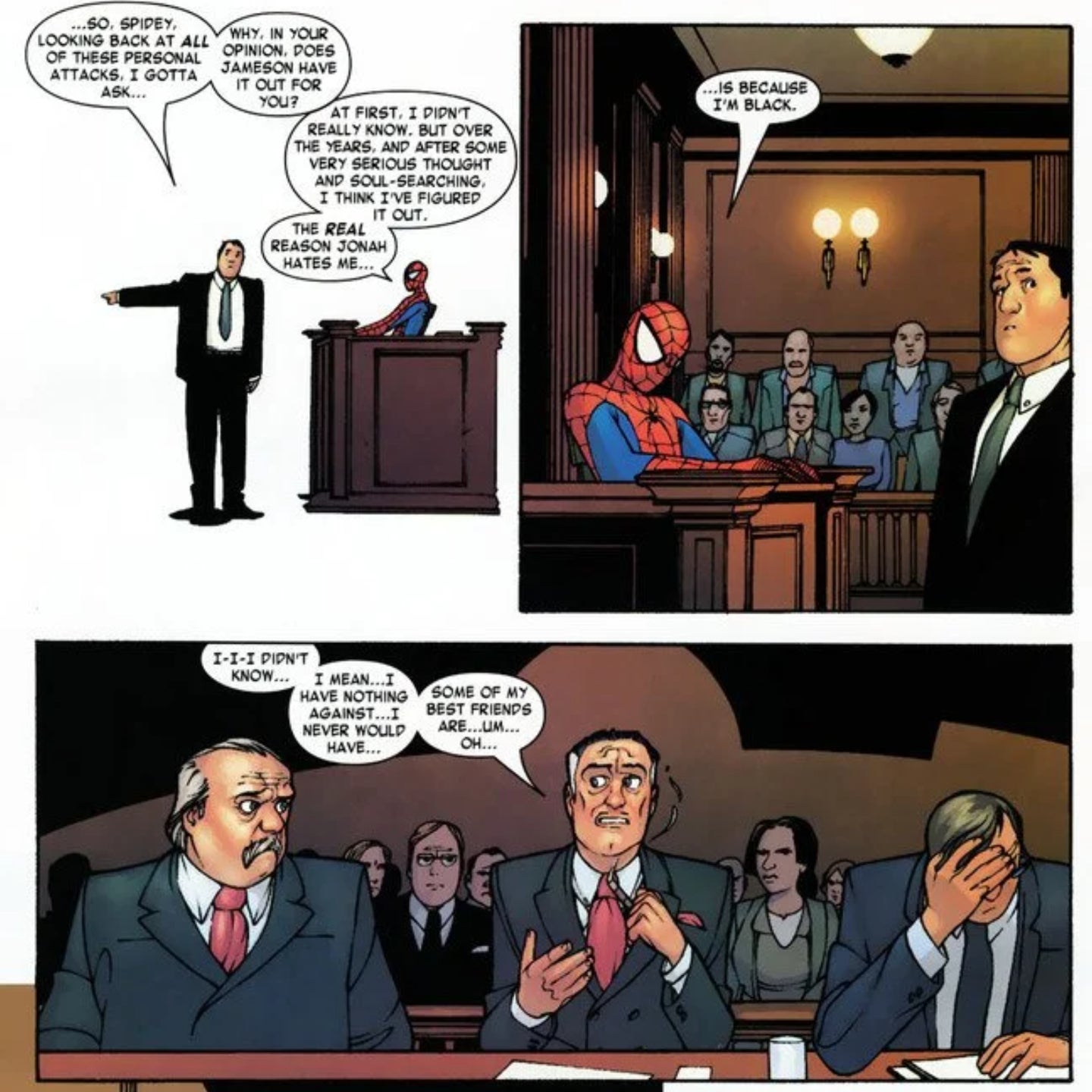 Dans ce numéro se produit une confrontation juridique qui couve depuis des décennies, alors que Spidey confronte enfin Jameson à propos de tous les innombrables gros titres et histoires effrayantes qui le décrivent comme une menace pour les citoyens de New York. Mieux encore, Spidey gagne presque l’affaire, et les lourds dommages-intérêts qui l’accompagnent, jusqu’à ce qu’il se rende compte qu’il va devoir rendre publique son identité secrète. La malchance de Parker frappe à nouveau.