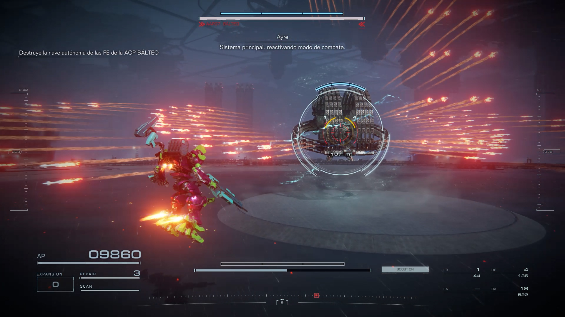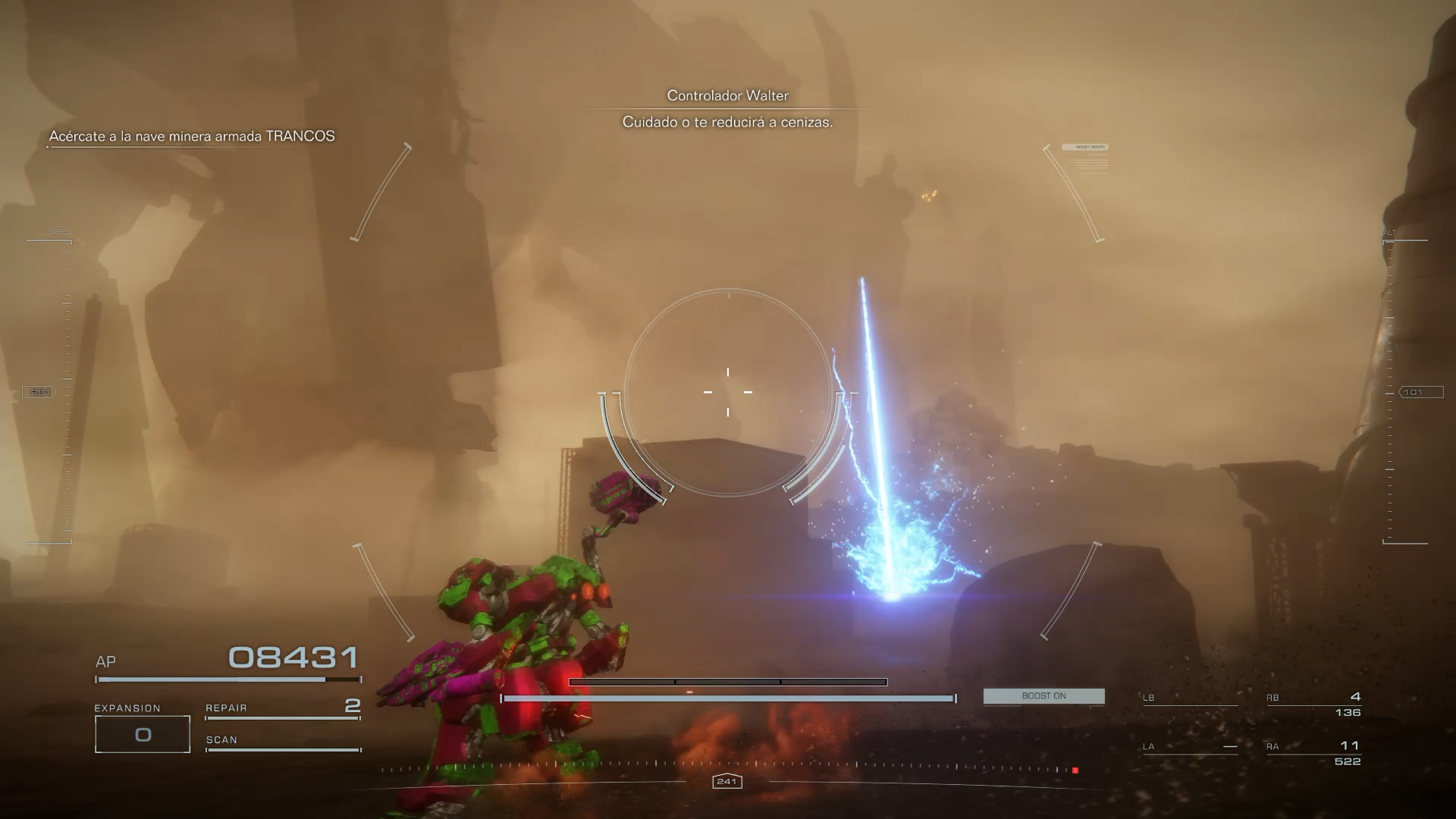 Mécaniquement Il est très différent des autres jeux auxquels vous avez pu jouer depuis FromSoftware. D’entrée c’est un jeu de tir, un détail que vous devez enregistrer en feu avant de commencer, car dans la bande-annonce vous voyez le mecha utiliser une épée, puis les frayeurs arrivent. Par conséquent, vous allez vous retrouver face à des affrontements, voire compliqués, dans lesquels la solution passera par un certain type d’arme disponible dans votre arsenal… Si vous avez pensé à l’acheter. Notez cela, nous y reviendrons plus tard, mais vous travaillez en trois dimensions avec une barre énergétique qui s’use beaucoup plus vite que dans Dark Souls et Elden Ring, avec la stabilité de Sekiro donnant autant de soucis que de joies et avec une utilisation constante des quatre boutons avant, parfois en les alternant et d’autres fois en les appuyant simultanément. Tu as une chance d’estus qui est dans la traverse et un scanner sur lequel j’ai dû appuyer par inadvertance au moins une centaine de fois. Vous ne pouvez pas non plus changer d’arme sur le terrain, ce qui donne une nouvelle nuance à l’idée d’essais et d’erreurs.