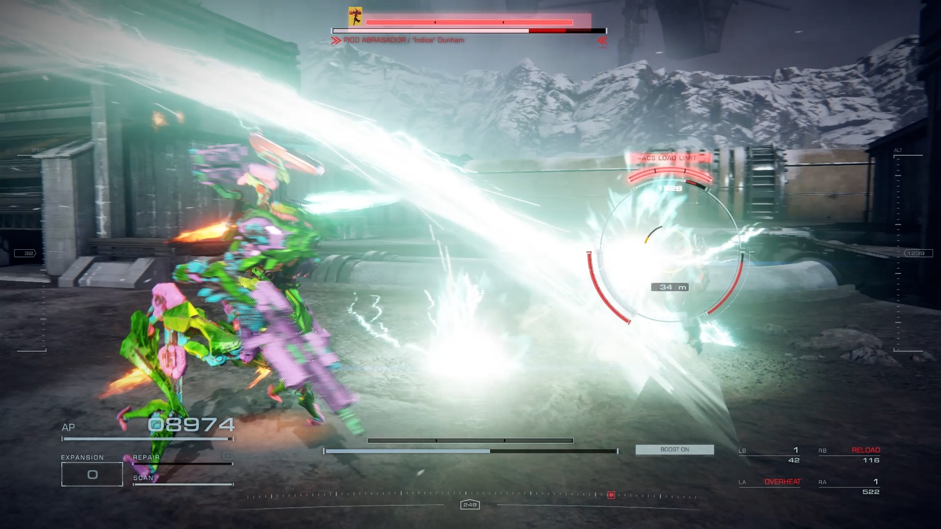 Comme il est dit dans tous les jeux FromSoftware, la section technique est juste (Évidemment, faire appel à la section technique équivaut à dire que la Justice League de Zack Snyder est mauvaise simplement parce qu’elle renonce à l’image panoramique). Ce n’est pas mal de loin, mais ce n’est pas extraordinaire. La section artistique, en revanche, est une autre affaire: avec les moyens techniques à votre disposition crée un cadre visuel d’un autre monde. Un monde au-delà du post-industriel, une sorte de ruine délabrée de ce qui était autrefois une planète. Les couleurs unies du métal et de la rouille se démarquent dans une palette complétée par le gris béton, le blanc neige et le beige sable. Un peu de vert militaire et de kaki aussi, mais dans l’ensemble, le jeu est clairsemé en couleurs. C’est logique, puisque a l’intention de nous emmener dans un monde dévasté dans lequel seules des machines d’extraction et des robots d’escorte habitent la surface. Et là, au milieu de l’immensité, nous sommes.