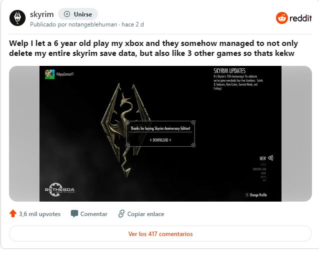 Le contrôle parental est un emballer parfait pour qu’un enfant n’ait pas accès à ces paiements en ligne. Cependant, cet utilisateur Xbox ne pouvait pas imaginer que son fils Supprime toutes les données de sauvegarde de Skyrim Combien de temps cela prendrait-il? Et ce n’est pas tout, car il a réussi à supprimer jusqu’à 3 jeux vidéo sans s’en rendre compte. Cette histoire était partagé sur skyrim subredditoù il était rempli d’expériences similaires d’autres joueurs.
