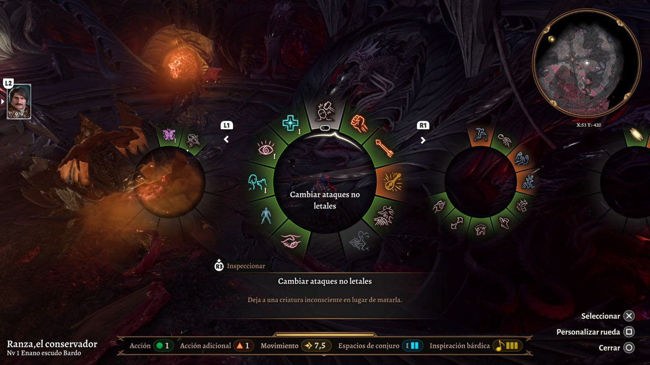 Pour le reste des possibilités, Baldur’s Gate 3 sur PS5 utilise un système de menus radiaux, auxquels on accède via le bouton R2, où sont concentrés toutes les actions, attaques, objets à utiliser et compétences disponibles. Nous pouvons afficher ces menus aussi bien à l’intérieur qu’à l’extérieur des combats, où, bien que le contrôle des personnages soit limité par les règles du combat au tour par tour (comme c’est le cas dans la version PC), la manipulation est assez similaire. Dès le début, nous avons plusieurs menus radiaux, entre lesquels nous nous déplacerons en utilisant R1 et L1.