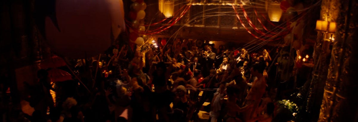 “Une scène compliquée pour laquelle nous avons conçu faire découvrir au public l’univers de cette fête. C’était un espace trop petit, cet espace étroit que nous avons tourné dans le hall de l’Ace Theatre, cet incroyable bâtiment des années 1920 au centre-ville de Los Angeles. Normalement, cette prise de vue aurait été réalisée avec une grue, mais nous n’avions pas l’espace pour avoir une grue dans cette pièce, nous avons donc dû le faire avec une chose appelée une caméra araignée. Essentiellement, vous avez un câble qui traverse l’ensemble du point A au point B. La caméra glisse le long de ce câble, puis il y a en fait un deuxième câble qui lui permet de glisser vers le bas.