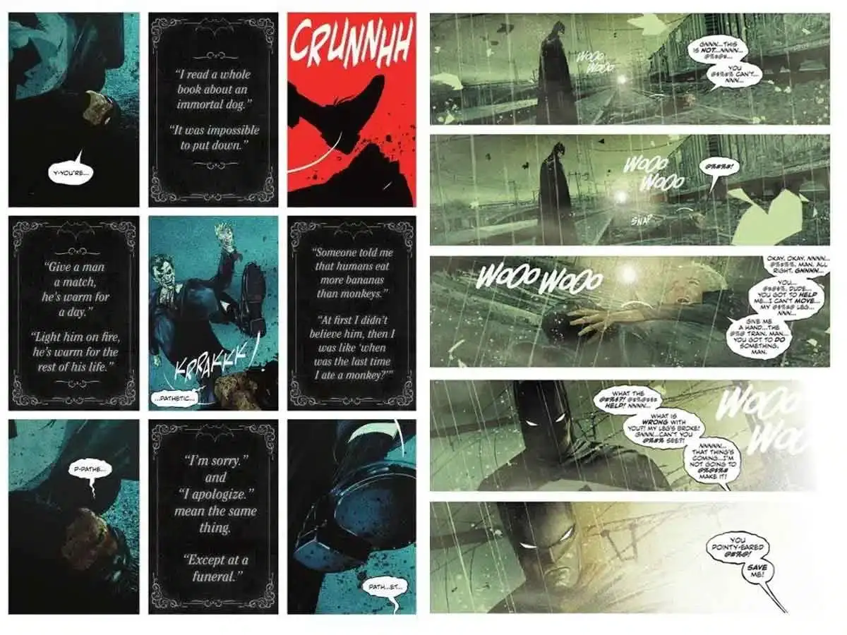 La poursuite, ainsi que le premier combat entre Batman et Joker, se déroule sur un total de six pages. Tout commence avec Joker sautant d’un troisième étage et poignardant un homme pour lui voler sa voiture. Batman le poursuit rapidement, utilisant son grappin pour arrêter la voiture que Joker conduit… avec une telle malchance qu’il finit par se faire toucher. C’est quand Joker sort de la voiture, donne un coup de pied au chevalier noir au visage et le jette d’un pont..