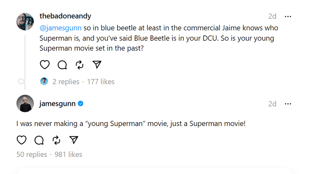 En réponse à un fan demandant des éclaircissements sur le moment où Superman: Legacy a lieu (en particulier si le “jeune film de Superman” remonte dans le temps), le cinéaste et PDG de DC Studios a déclaré à Threads: “Je n’ai jamais fait de film de ‘ jeune Superman’, juste un film de Superman !“.