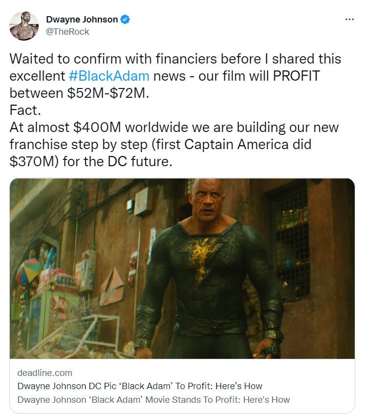 Une partie de la raison pour laquelle nous avons décidé de creuser dans les chiffres de tout cela est à cause de quelque chose que The Rock a tweeté. C’est tweeté est venu après que le magazine spécialisé Deadline ait publié un article sur comment on s’attendait à ce que Black Adam fasse des bénéfices. Cette histoire est apparue en réponse à un article de Variety déclarant que le film “pourrait perdre entre 50 et 100 millions de dollars à sa sortie”.