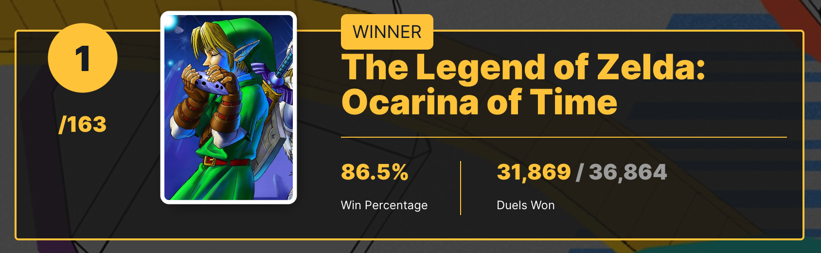 Ocarina of Time a été le grand gagnant avec un pourcentage de gain de 86,5 %mais super mario 64 il lui a tenu tête avec un pourcentage du 79,9%. Comme Ocarina of Time, Super Mario 64 a changé ce que nous pensions possible avec les jeux vidéo et introduit dans le monde spectaculaire de la 3D.