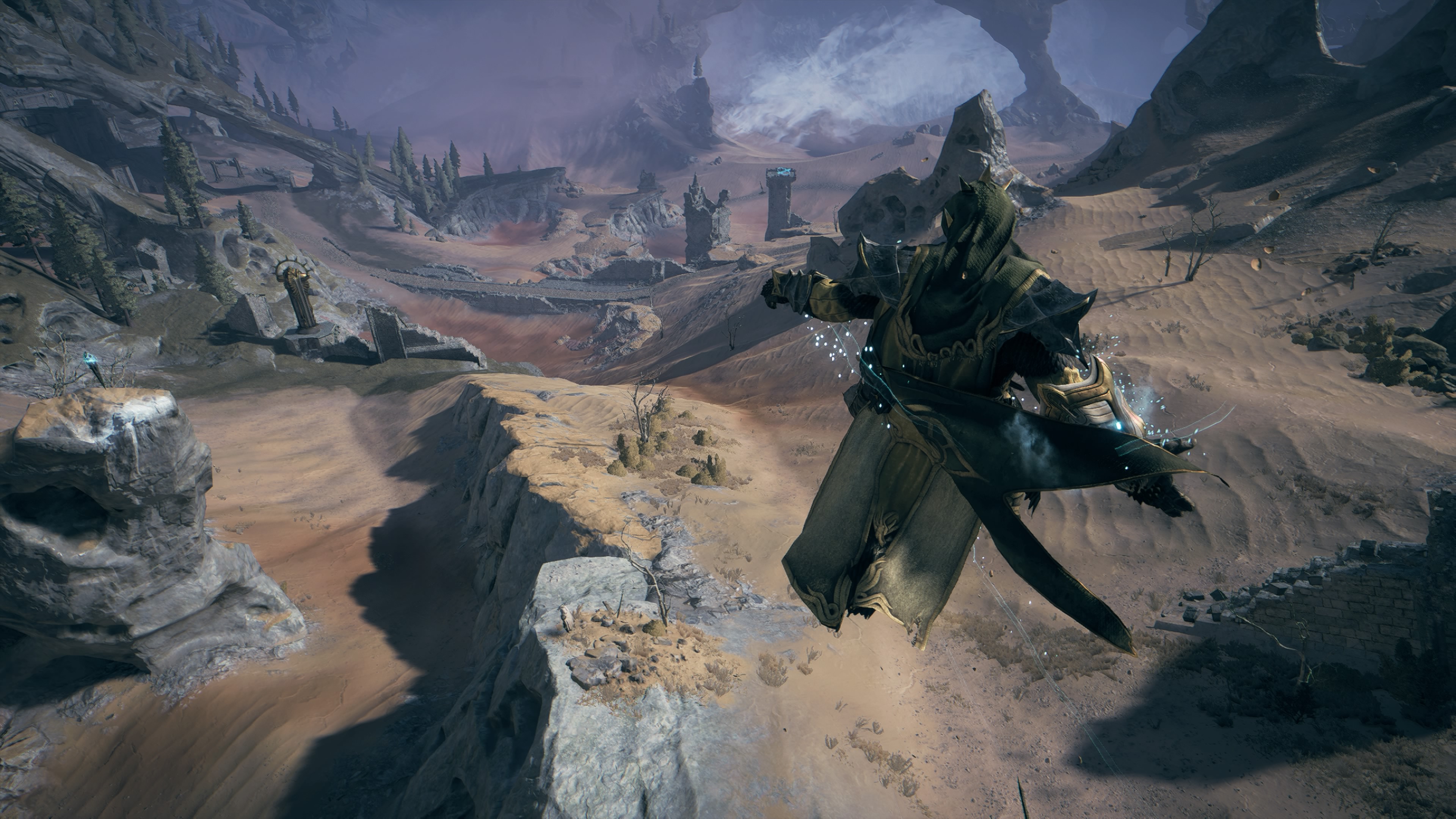 Dans le monde, il y a des enclumes (en plus d’autres constructions) enterrées dans le sable, que notre personnage pourra « renflouer » en utilisant les pouvoirs. Ces structures fonctionnent comme des points de contrôle, où nous pouvons nous reposer, améliorer notre armure, nos talents…etc. Comme les feux de joie dans Dark Souls, pour se comprendre. Le monde est principalement vide, à l’exception de certains affrontements secrets ou aléatoires avec des ennemis, mais comme le mouvement est si rapide, il ne gêne pas. C’est un peu le “vide” ressenti dans Shadow of the Colossus. Les deux jeux sont incomparables, mais ils me donnent un sentiment similaire lorsque je parcours leurs énormes paramètres.