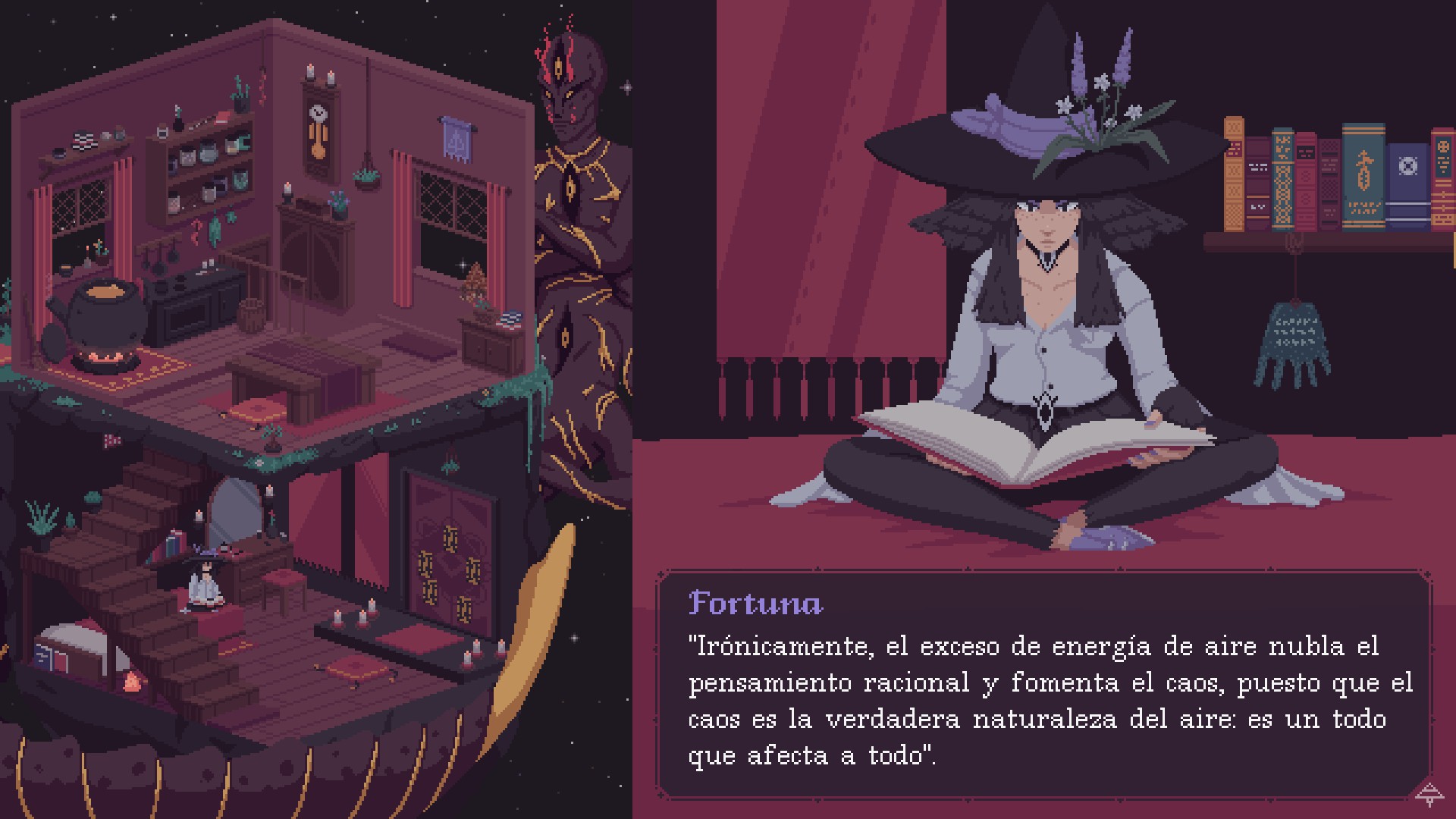 Lorsque le jeu commence, notre punition cosmique a été adoucie, nous permettant de recevoir des visiteurs afin que nous puissions renouer avec le monde et le coven. Nous profiterons de ces visites pour en savoir plus sur la mythologie de cet univers intéressant régi par les diktats de la Roue Cosmique, mais aussi pour jeter cartes à tous ceux qui passeront par notre fenêtre. Petit à petit, non seulement nous acquerrons plus de cartes et de pouvoir, mais nous découvrirons également le sens du mot “destin” à travers les décisions et les lectures que nous ferons.